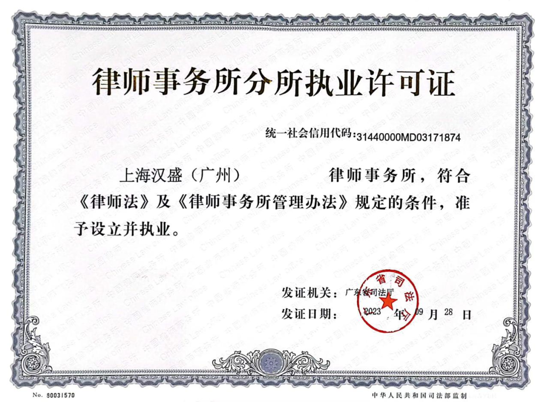 2023年9月28日,上海汉盛律师事务所取得广东省司法厅颁发的《律师事务所分所执业许可证》,汉盛广州分所正式设立并执业。广州分所是汉盛打造国际化综合型律师事务所的重要一环,也是汉盛规模化发展之路上的又一重要里程碑。